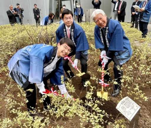 開催に先立ち3月15日には、西側植栽エリアに「北斎桜」2本が植えられ、山本亨区長=写真中=、澁谷哲一館長=同右=、「葛飾北斎博士ちゃん」で知られる目黒龍一郎さんが植樹式に出席。国内でも希少な品種の開花は数年後になりそうだが、日々の成長が楽しめる。