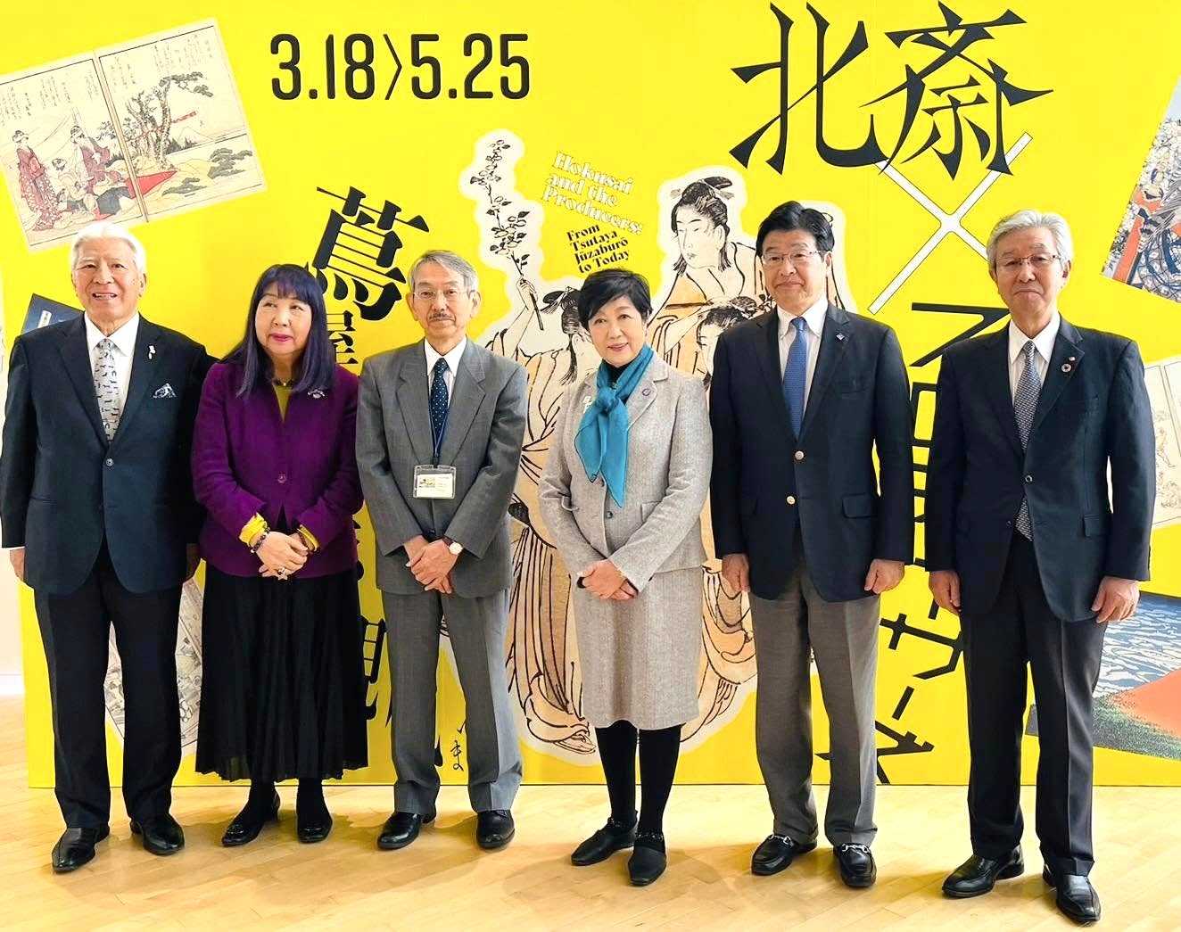 〇…東京都の小池百合子知事が4月2日に来館、企画展を鑑賞した。同1日に就任した大久保純一新館長、前館長で墨田区文化振興財団・澁谷哲一理事長、山本亨区長、東京東信用金庫・中田清史理事長、服部栄養料理研究会・服部津貴子会長らと談笑、北斎作品への関心の高さをのぞかせていた。