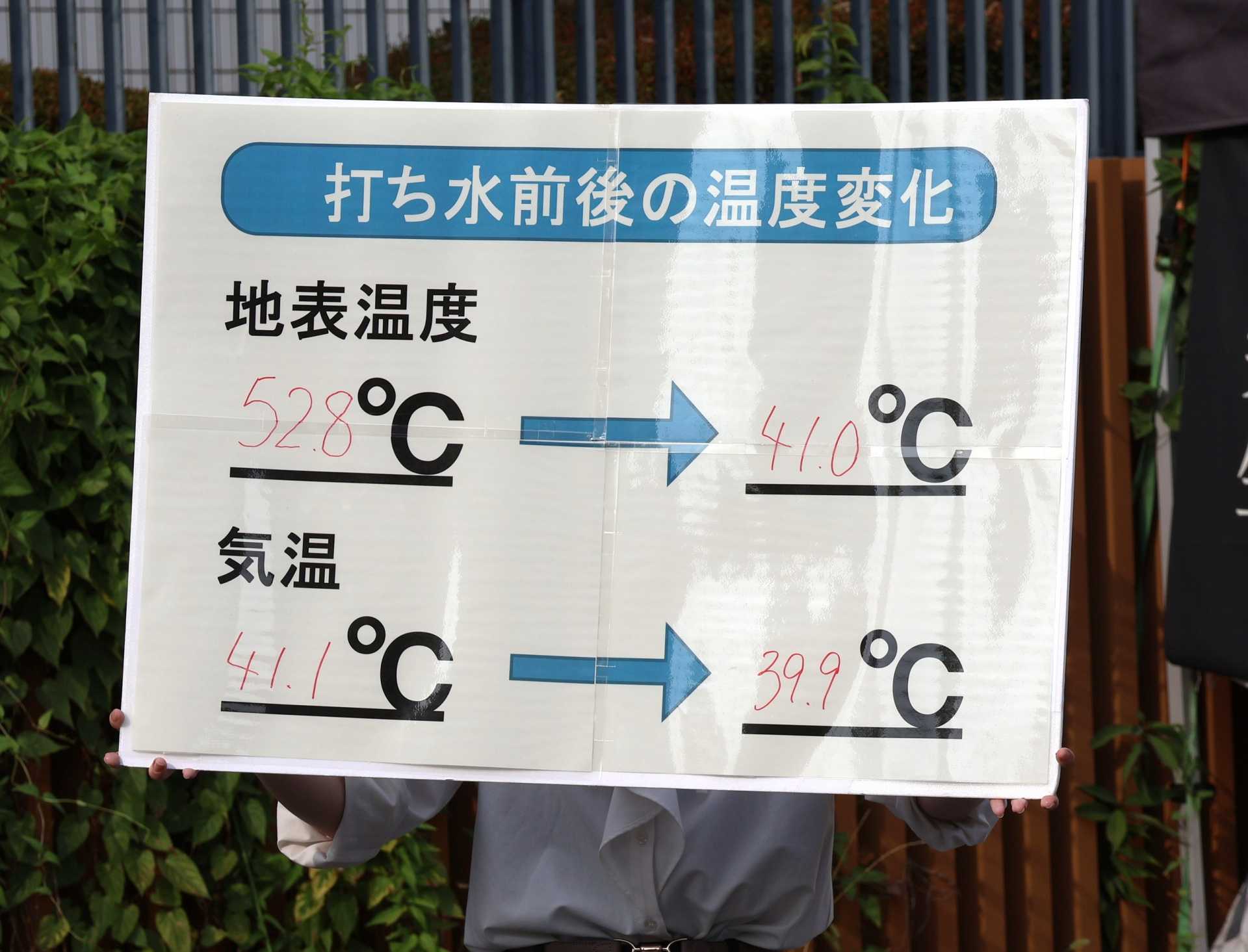 地表温度も52.8度にも上昇する中、山本区長はイベント前のあいさつで「8月に入って地球沸騰化とも言われるような気象状況のなかで、熱中症も含め、命の危険にまで及ぶのではないかという日が続いている」と説明。地球温暖化など環境問題への取り組みを区としても引き続き注力するとした上で「打ち水という日本古来の知恵でもある暑さ対策をみんなで共有できれば」とスピーチ。西岩親方らと行った打ち水で地上温度は41.0度まで下がり、参加者らとともに一時の涼を感じていた。