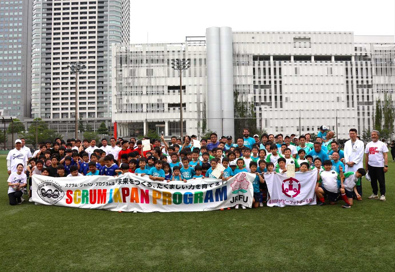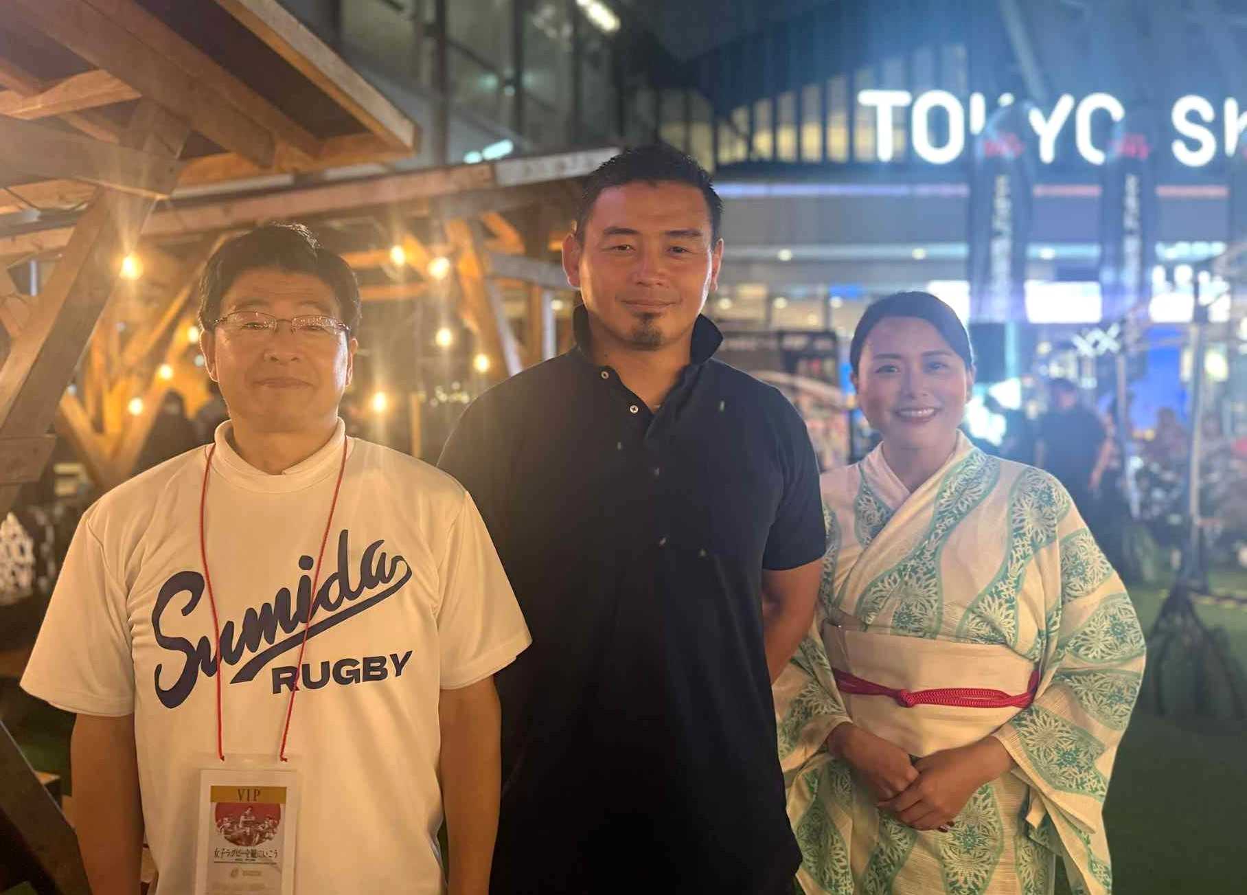 墨田区ラグビーフットボール協会(しもむら緑会長=写真右=、大谷浩一郎理事長)が6月8日に錦糸公園野球場で3回目のラグビー区民スポーツ大会を開催した。未就学児や小学生のラグビー体験会、高校生対象のラグビークリニックなどに約150人が参加。「女子ラグビーワールドカップ(W杯)2025」イングランド大会開幕を前に、しもむら会長は「ぜひ盛り上げていきたい」と意欲。実際に、8月24日に行われた女子日本代表VSアイルランド戦の8月24日の試合を、東京スカイツリー4階スカイアリーナで主管としてPV開催。男子ラグビー元日本代表・五郎丸歩氏=同中=をゲストに招き、山本亨区長=同左=も訪れ約500人が観戦。サクラフィフティーンは14―42と負けたが、すみだの夏の夜をラグビーで熱く盛り上げた。