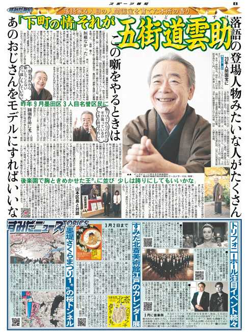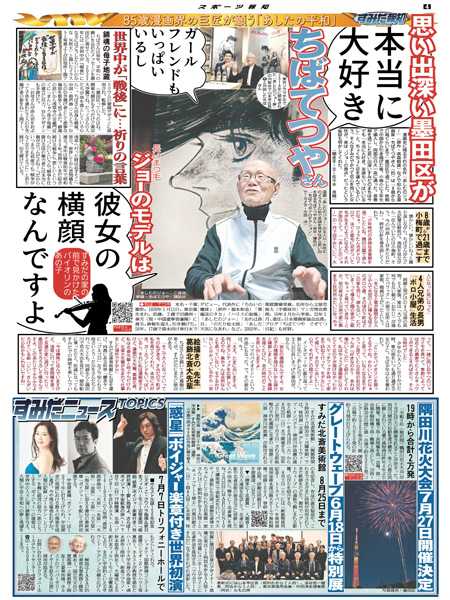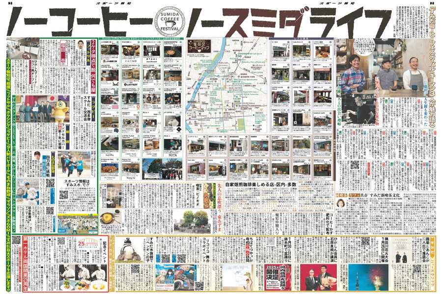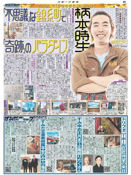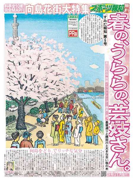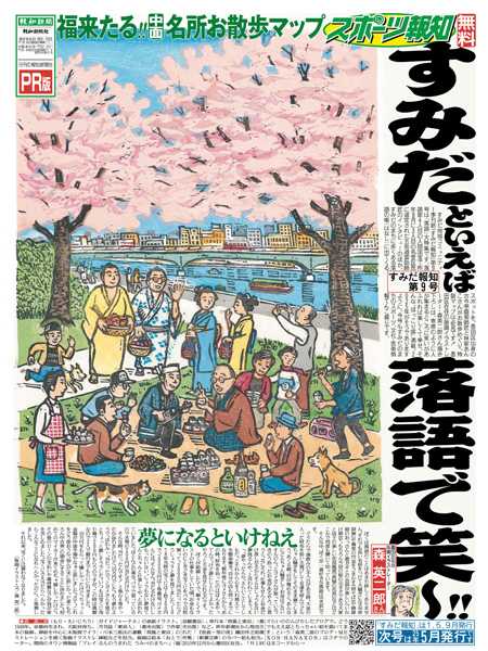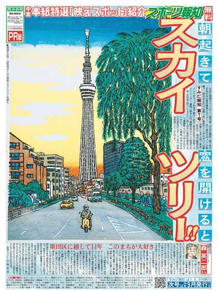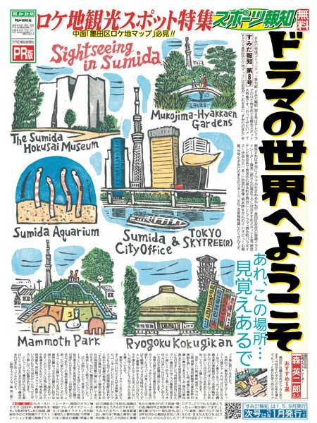 報知新聞社は「創刊150周年」を迎えた2022年6月に東京本社を墨田区横網に移転、地域コミュニティー季刊紙「すみだ報知」を創刊しました。大相撲の両国国技館での開催、1、5、9月の年3回発行するフリーペーパーの1面は、墨田区在住の版画イラストレーター・森英二郎さん描き下ろしで、区内各所に配置。web版もスタート。すみだのまちのスポーツ、文化、芸術情報など地域に密着したニュースをお伝えします。